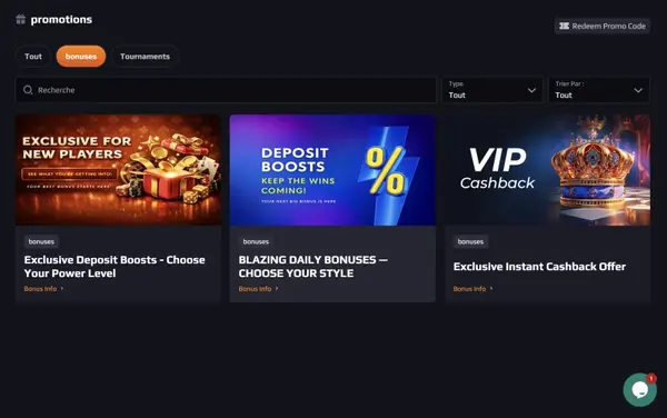Notre système de fidélité est basé sur l’XP : vous gagnez des points en jouant et vous progressez par paliers de Bronze à Gold et au-delà . À mesure que votre niveau augmente, vous pouvez recevoir un accès plus fréquent aux promotions et une meilleure priorité de service. Le VIP est également structuré par niveaux, et les niveaux supérieurs peuvent débloquer des limites de retrait plus élevées que les comptes standards.
