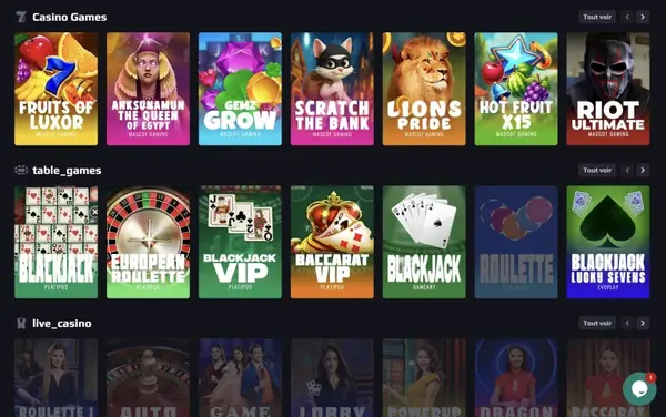 BlazeSpins Casino propose environ 13 000 jeux : machines à sous, jeux de table, titres casino live, sport virtuel, bingo, poker et jeux crash. Comme le RTP global n’est pas divulgué publiquement pour l’ensemble du casino, nous recommandons de vérifier le RTP et les règles dans l’écran de chaque jeu. Les filtres du lobby vous aident à trier par catégorie et par fournisseur, ce qui est utile si vous recherchez un style familier.